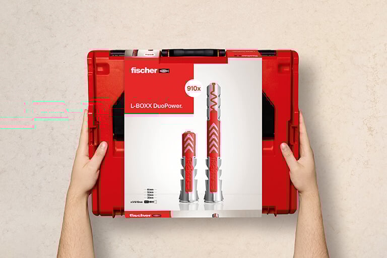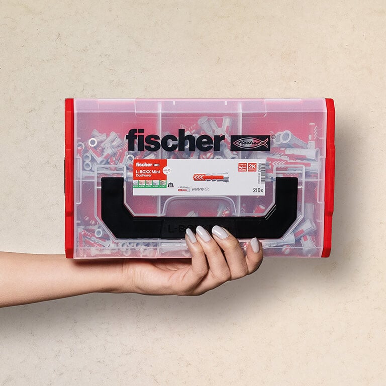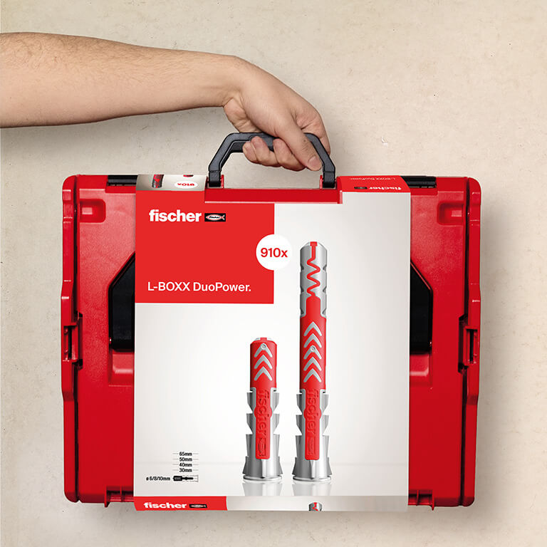 Die L-BOXX 102 ist prall gefüllt mit einer umfangreichen Auswahl an fischer Produkten – ideal für Befestigungen in unterschiedlichen Untergründen wie Beton, Ziegel, Gipskarton, Holz, Porenbeton oder Naturstein.