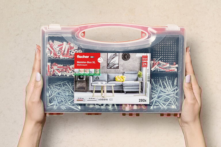 Gefüllt mit leistungsstarken fischer Dübeln, bietet sie sicheren Halt in unterschiedlichsten Materialien wie Beton, Ziegel oder Gipskarton.