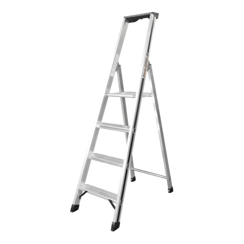Die Plattformleitern sind mit Kipprollen und einem langem Handlauf ausgerüstet. Am Stützteil wurden Rollen angebracht und ein leichtes Verschieben wird durch das Anheben am Leiterteil gewährleistet. Plattformleitern eignen sich vor allem für Einsatzbereiche, bei denen ein dichtes Heranfahren an Regale erforderlich und eine Verwendung von Podestleitern mit breitem Fahrwerk nicht möglich ist. Für die hohe Standsicherheit der Plattformleitern sorgen die serienmäßige Ausstattung mit starren Streben sowie die stabilen Aussteigungsstreben am Antritt. Die Leitern verfügen außerdem über eine große Ablageschale, in der sich Werkzeuge und Kleinteile praktisch unterbringen lassen. Eimer und andere Kleingeräte können an den praktischen Einhängehaken befestigt werden.