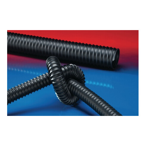 Anwendungen : flexibler Schlauch für hohen Durchsatz an warmem und abrasivem Pulver, Schüttgut, Granulat und für warme Gase, Folienblasanlage, Kühlluft am Extrusionswerkzeug, Offsetdruckmaschine: Luftversorgung, Luftversorgungsschrank, Kühlluft: UV Trockner, IR/Infrarot Trockner, Textilindustrie, Dampfabsaugung: Dampfbügeleisen, Dampfbügelautomat, Bügelpresse, Verdichter/ Kompressor, Seitenkanalverdichter, Vakuumpumpe, Druckpumpe, Pumpe Eigenschaften : mittelschwere Ausführung, hoch abriebfest, sehr gut hitzebeständig (besser als vergleichbares TPE und Neopren), gute Öl-, Benzin- und Chemikalienbeständigkeit, sehr gute Kälteflexibilität, RoHS konform Konstruktion : 1. in der Wandung fest eingegossener Federstahldraht, 2. Wandung: patentiertes spezial Premium Hochtemperatur-Polyurethan HT-PUR (Pre-PUR ® ), 3. Wandstärke ca. 1,0 mm Temperaturbereich : 40 bis +125 ºC (kurzz. +150 °C) Liefervarianten : weitere Ausführungen, Abmessungen und Längen auf Anfrage lieferbar Weitere technische Eigenschaften: · Biegeradius: 126mm · Aggregatzustand: Fest / Gasförmig