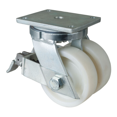 - Produkttyp: Lenkrollen mit Rad-Totalfeststeller (Ø 100+125 mm Feststeller im Vorlauf)