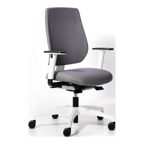 mit Synchrontechnik (mit Armlehnen) · für überwiegend sitzende Tätigkeiten · stabiles Kunststoff-Fußkreuz weiß oder schwarz · Rückenlehne mit Polsterauflage · der Rückengegendruck passt sich automatisch in jeder Sitzposition dem Körpergewicht an, mit integrierter Sitzneigung (-3°) · Sitztiefenverstellung 50 mm mittels Schiebesitz · Armlehnen höhenverstellbaren, mit PU-Auflage · Sitzbezug 100 % Polyester · Sitzfläche B 490 x T 400-450 mm · Sitzhöhe 390-x 510 mm · Lehnenhöhe 580 - 660 mm · Universalrollen für harte und weiche Böden Lieferung erfolgt zerlegt