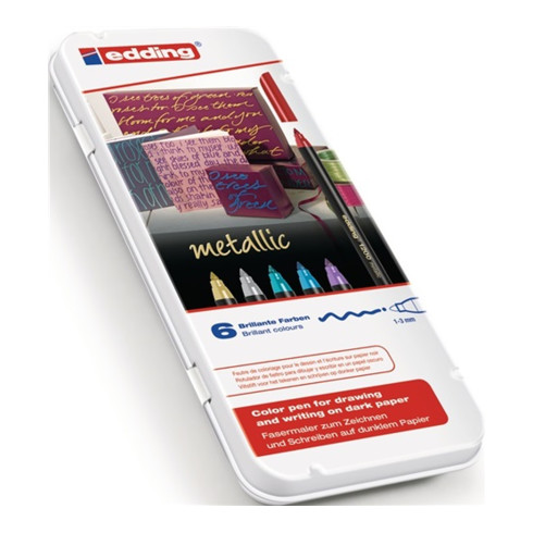 deckende Metallicfarbe · wassergelöste Tinte · lichtbeständige Tinte für länger andauernde Ergebnisse für Arbeiten, bei denen es besonders auf genaue und präzise Schreibbewegungen ankommt, wie Zeichnungen, Schriften und Layouts · geeignet für Papier und Pappe · farbig sortiert · Box mit 6 Farben (je 1 x silber, gold, rot metallic, grün metallic, blau metallic, violiett metallic)