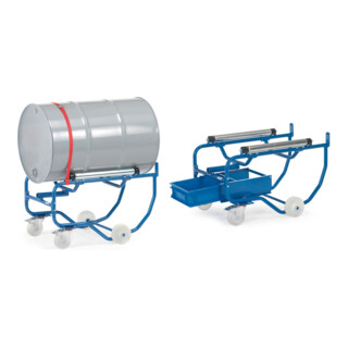 - Stahlrohr-Konstruktion, verschraubt, pulverbeschichtet blau RAL 5007. Spanngurt zur Fass-Sicherung
