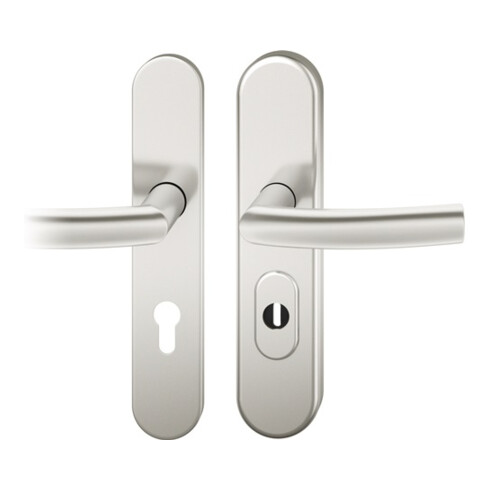 Langschild-Garnitur · für Außentüren · geprüft nach DIN 18257 · außen gekröpfter runder Flachknopf · innen Türgriff fest/drehbar gelagert · Drückerausführung FSB 1107 · verdeckte, durchgehende Befestigung · Lochung PZ, mit Zylinderabdeckung · Türstärke 67-69 mm · DIN links / rechts · Widerstandsklasse ES 1 Weitere technische Eigenschaften: · Breite: 54mm · Länge: 246mm · Abdeckung: mit Zylinderabdeckung · Schildstärke: 15 mm · Farb-Nr.: 0105