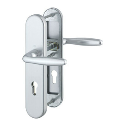 für Abschlusstüren · einbruchhemmend nach DIN 18257 · Stahl-Unterkonstruktion im Außen- und Innenschild · mit Rückholfeder-Paket · außen: gekröpfter, feststehender Kopf (ummontierbar) · innen: loser Türgriff,