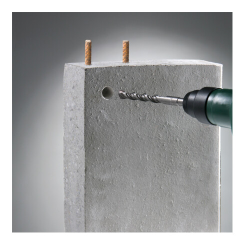 - Hammerbohrersatz, Aufnahmeschaft für SDS plus, selbstzentrierende Bohrspitze, hochtemperaturgelötet, Mehrfach-Spirale für optimalen Bohrmehltransport, minimale Wandreibung und minimierte Wärmeentwicklung, vibrationsoptimiert