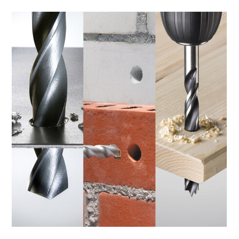 - HSS, HM-Steinbohrer und Holz-Spiralbohrer in einem Kombi-Bohrersatz mit Sechskantaufnahme 1/4“; Aufnahme nach ISO 1173, E 6.3. Die meistgenutzten Bohrerdurchmesser in einem praktischen Set