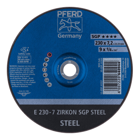 inkl. MwSt.PFERD TOOLS Schruppscheibe E 230x7,2x22,23 mm ZIRKON Speziallinie SGP STEEL für Stahl