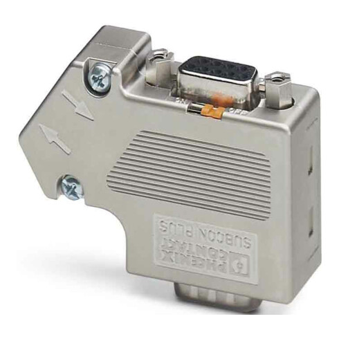 - D-SUB-Stecker, 9-polig, Stift, Kabelzuführung unter 35°, Bussystem: PROFIBUS DP bis 12 MBit/s mit PG-D-SUB-Buchse zum Anschluss eines Programmiergeräts, Abschlusswiderstand ü