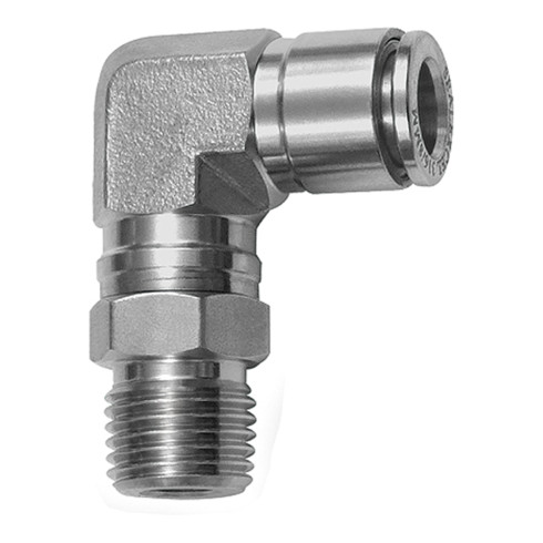 - L-Steckverschraubung, drehbar, R 1/2 a., für Schlauch-Außen-Ø 16 mm, Arbeitsdruck max. 20 bar, Edelstahl 1.4404. Für den Einsatz in aggressiveren Umgebungen und bei korrosiven Medien