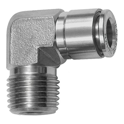 - L-Steckverschraubung, R 3/8 a., für Schlauch-Außen-Ø 12 mm, Arbeitsdruck max. 20 bar, Edelstahl 1.4404. Für den Einsatz in aggressiveren Umgebungen und bei korrosiven Medien