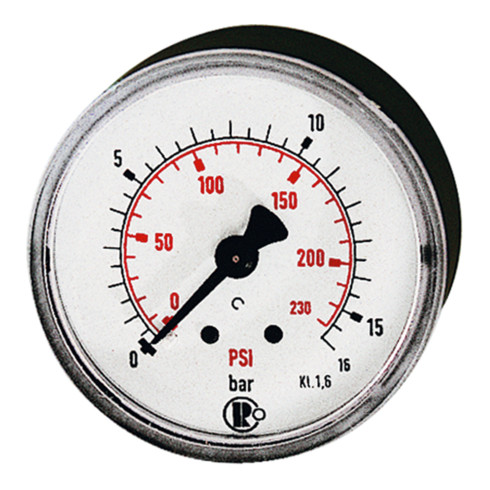 - Standardmano., Kunststoffgeh., Doppelskala bar/psi, Anschluss hinten zentr., G 1/4, Gütekl. 1,6, Messber. 0-10,0 bar/145 psi, Ø 50. Rohrfedermanometer in Standardausführung