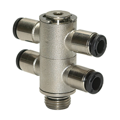 - T-Mehrfachverteiler 4-fach »click-clock«, drehbar, G 1/8 a., für Schlauch-Außen-Ø 8 mm, Arbeitsdruck max. 16 bar, Messing vern