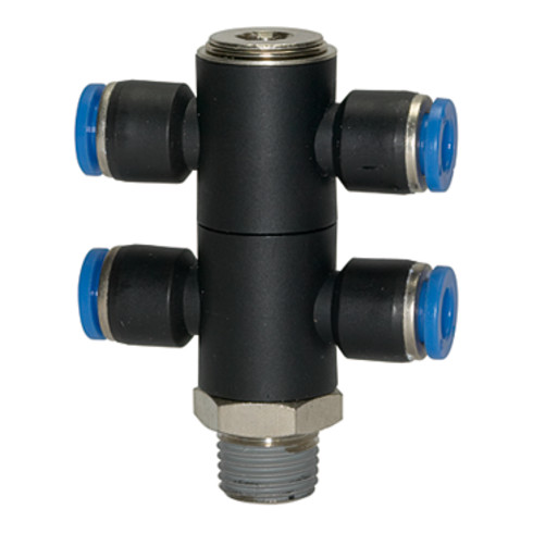 - T-Mehrfachverteiler »Blaue Serie«, 4-fach, drehbar, R 1/4 a., für Schl.-Außen-Ø 8 mm, Arbeitsdr. max. 15 bar, Kunststoff/MS vern