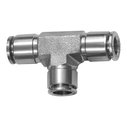 - T-Steckverbindung, für Schlauch-Außen-Ø 16 mm, Arbeitsdruck max. 20 bar, Edelstahl 1.4404. Für den Einsatz in aggressiveren Umgebungen und bei korrosiven Medien