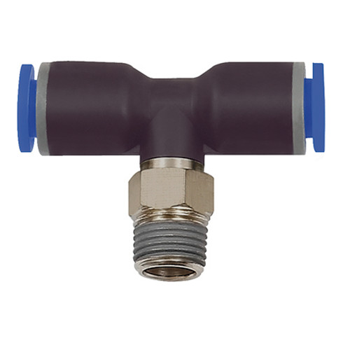 - T-Steckverschraubung »Blaue Serie«, drehbar, R 3/8 a., für Schlauch-Außen-Ø 12 mm, Arbeitsdruck max. 15 bar, Kunststoff/MS vern