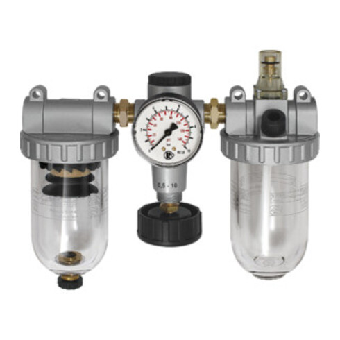 - Dreiteilige Wartungseinheiten, bestehend aus einem vordruckunabhängigen, rücksteuerbaren Membrandruckregler mit Sekundärentlüftung, einem Zentrifugalabscheider und einem Proportionalöler