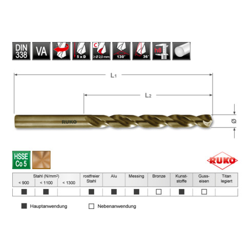 inkl. MwSt.RUKO Spiralbohrer DIN 338 Typ VA HSSE Co 5 in SB-Tasche Ø 12,0 x 151 x 101 mm