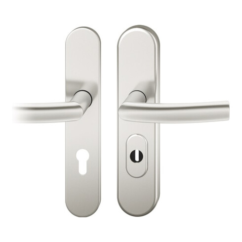Langschild-Garnitur · für Außentüren · geprüft nach DIN 18257 · außen gekröpfter runder Flachknopf · innen Türgriff fest/drehbar gelagert · Drückerausführung FSB 1107 · verdeckte, durchgehende Befestigung · Lochung PZ, mit Zylinderabdeckung · Türstärke 67-69 mm · DIN links / rechts · Widerstandsklasse ES 1 Weitere technische Eigenschaften: · Breite: 54mm · Länge: 246mm · Abdeckung: oval, mit Zylinderabdeckung · Schildstärke: 15 mm · Farb-Nr.: 0105