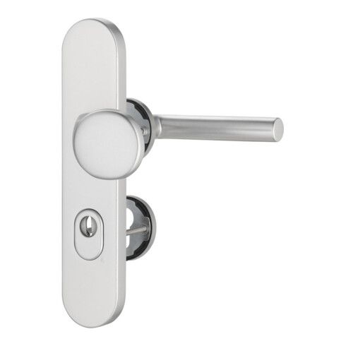 Kombi-Schutzgarnitur mit Rosettenverschraubung · Grundkonstruktion: innen = Stahl, außen = Druckguss, bei Ausführung mit ZA = massives Aluminium · Ausführung Innenrosetten: Ø 55 mm, Stärke 8 mm · Drücker-Lagerung: lose · Drückertyp und -stärke: 108 mit Ø 22 mm · Knopfausführung: K2 (gekröpft) · Stütznocken: M5, Ø 8 mm · Verschraubung: 4-fach M5, verdeckt · Spezialrollenwechselstift mit M12-Gewinde · Modell 8742 = Außenschild mit Anbohrschutz und Zylinderabdeckung: federnd gelagert für 11 - 14 mm Überstand · Entfernung 72 mm · DIN links / rechts · Vierkant 8 mm · Wechselgarnitur Weitere technische Eigenschaften: · Breite: 54mm · Länge: 250mm · Abdeckung: mit Zylinderabdeckung · Schildstärke: 15 mm · Farb-Nr.: F1