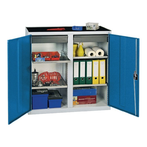 Stahlblechkonstruktion mit widerstandsfähiger Pulverbeschichtung · ausgestattet mit Schubladen und herausziehbaren Fachböden, mit allseitigem Rand, Höhe 30 mm, auf kugelgelagerten Präzisionsauszügen, 80% ausziehbar · Schubladen, H 100 mm und Fachböden im 33-mm-Raster höhenverstellbar · Tragfähigkeit pro Fachboden/Schublade 35 kg · obere Ablage mit Abrollrand · Flügeltür abschließbar mit Zylinderschloss und Drehriegelverschluss mit 3-Punkt-VerriegelungLieferung erfolgt ohne Inhalt · Weitere technische Eigenschaften Tragfähigkeit pro Schublade: 35kg